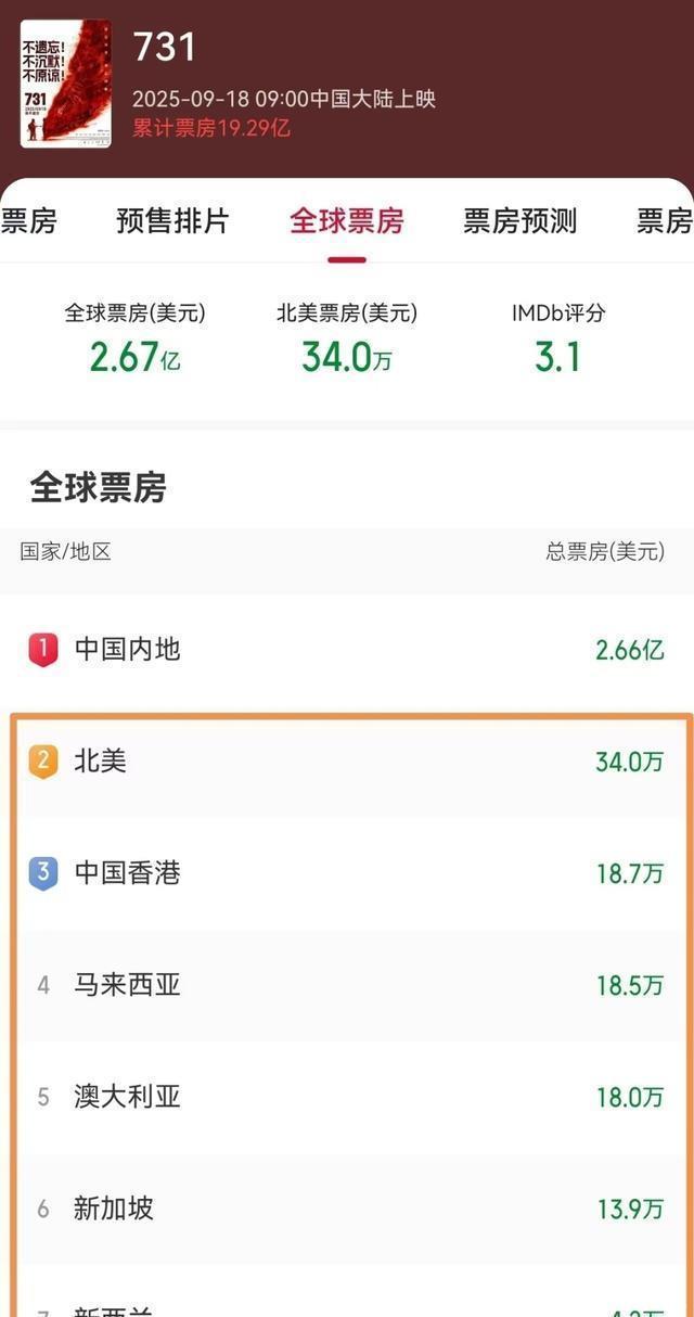 我们再看看,《731》的其他地区的票房如何? 影片于9月18日在北美同步公映,首周末三天报收34万美元,后面排片直接没了。 中国香港地区拿到18.7万美元,紧跟其后的是马来西亚的18.5万美元,澳大利亚18万美元,新加坡13.9万美元和新西兰的4.2万美元。 从数据中可以看出,《731》的票房走势和《哪吒2》一样,也是中国内地市场占大头,其余的都可以忽略不计了。 这主要原因还是口碑不行造成的,另外海外发行还是有所欠缺。