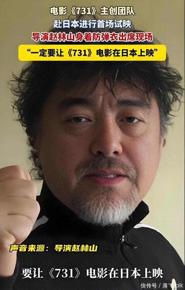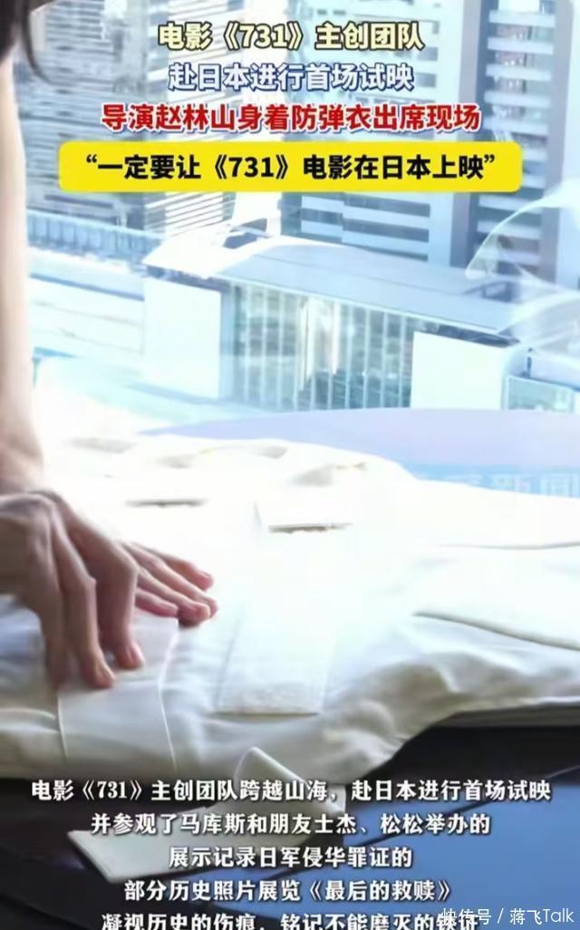 二、《731》日本试映,对外宣发:赵林山穿防弹衣出席。 既然如此“重磅”的电影,怎么能缺席全球第三大票仓——日本市场呢?之前导演赵林山曾说过,一定要把这部电影带到日本去。 没想到,赵导竟然说到做到了。 视频中,他把防弹衣放到床上解开,然后穿在自己的身上,并举起拳头说了一句: 一定要让《731》在日本上映。