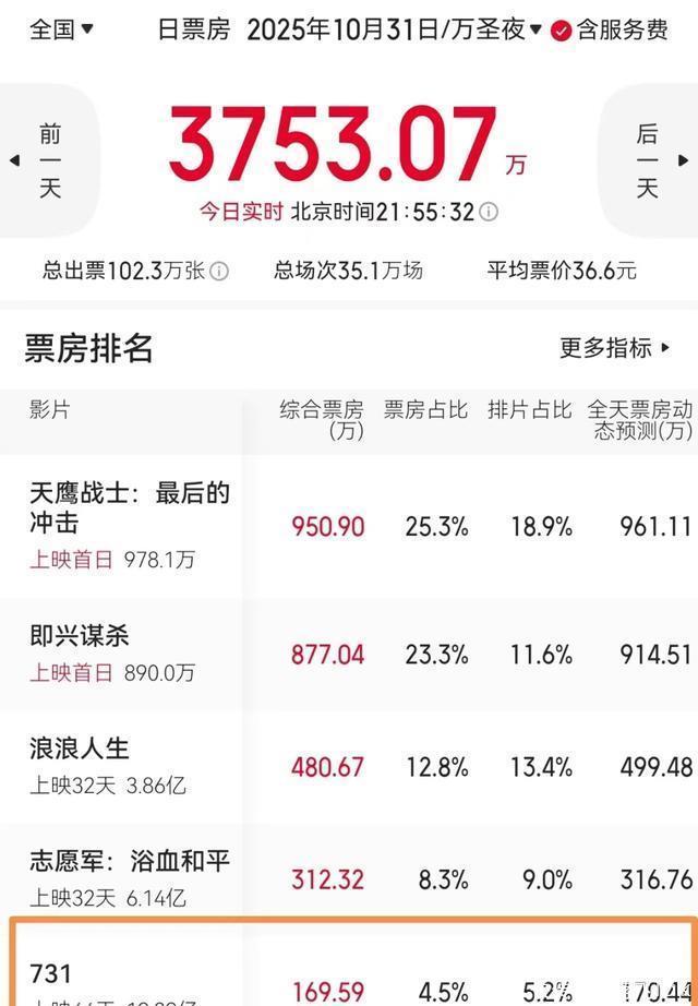一、《731》全球票房分析。 10月31日,为本月最后一天,也是新的周五开画日,在北美又称为万圣夜,基本都以惊悚片主打,前三甲也终于不再被国庆档老片霸占了。 截止22点,黄渤主演的《浪浪人生》终于交出了蝉联日冠,日票房为480万,退居到季军的位置,内地总票房达到3.85亿。 此片在后续走势中,全面超越了陈凯歌的《志愿军3》和路阳的《刺杀小说家2》,算得上长线小卖了,最终的落点票房约在4.4亿左右。